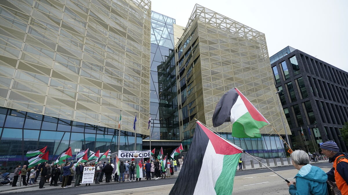 A protest organised by the Ireland-Palestine Solidarity Campaign outside the Central Bank of Ireland in May. The Central Bank last month came under mounting pressure to reject the prospectuses of Israeli bonds, which are largely being used to fund the country's war efforts in Gaza.